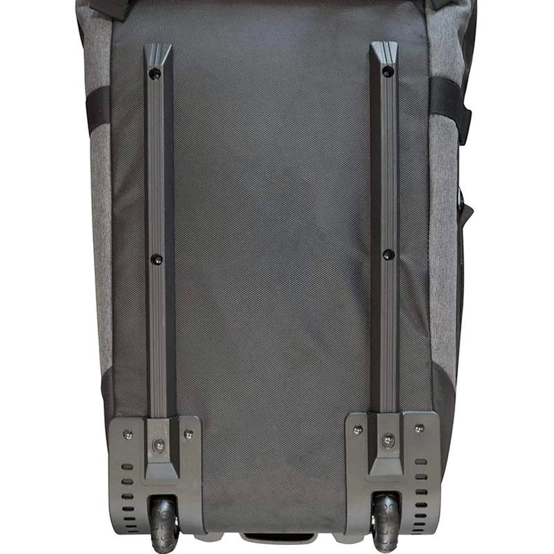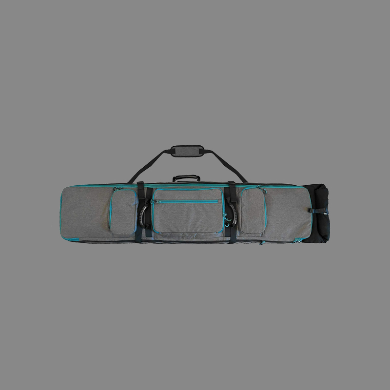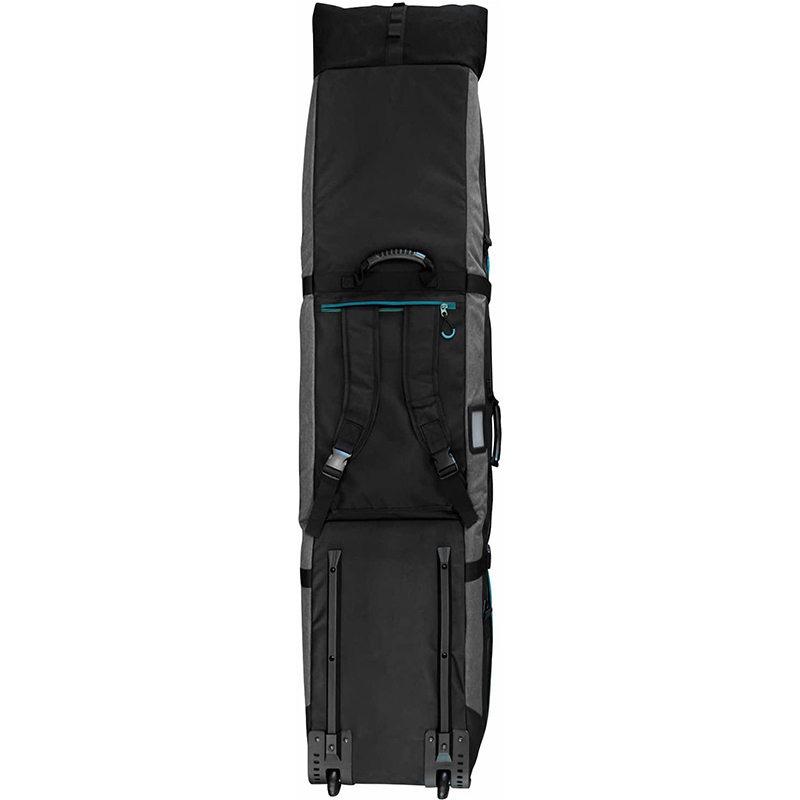This snowboard travel bag features a wide zipper opening for convenient storage of skis, boots, and a helmet.